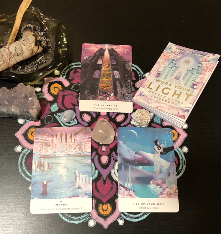 My newest deck of oracle cards is the ‘Work Your Light’ cards from the author of “Light is the New Black” and “Rise Sister Rise” which I’ve posted about on this blog (see books). My first time pulling cards was a few weeks ago and it was a profound reading. I pulled the cards, read what they mean, and then just left the cards as they were for weeks. I have actually yet to put them back in the box as I feel I was still processing this reading. There are different ways you can pull cards, as described in the handy dandy guidebook that comes with the deck. I always pull 3 cards. I connect with the number 3 in many ways and that’s just what works for me. Rebecca describes this as “The Holy Trinity” the first card represents the head, second the body, and the third the heart.